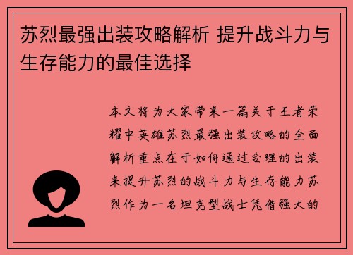 本文将为大家带来一篇关于《王者荣耀》中英雄苏烈最强出装攻略的全面解析,重点在于如何通过合理的出装来提升苏烈的战斗力与生存能力。苏烈作为一名坦克型战士,凭借强大的控制技能和持续输出能力,在团战中往往起到了关键性作用。然而,要最大化苏烈的优势,仅依赖技能释放是远远不够的。选择合适的装备,可以使苏烈在不同的战斗场景中发挥出最佳状态。本篇文章将从四个方面详细阐述苏烈的最佳出装策略:基础出装、战斗力提升装备、生存能力强化装备和适应性出装策略。每个方面将逐步分析如何选择出装,如何提升苏烈在不同阶段的综合能力,从而使其在战斗中占据上风。